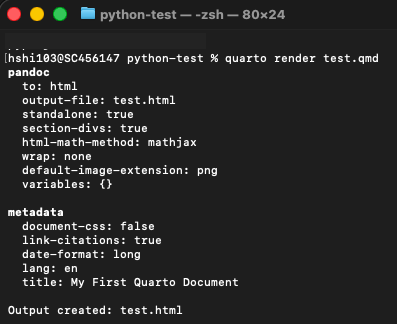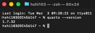 Just like we did with Python, let’s make sure Quarto installed correctly. Open your terminal again and type: