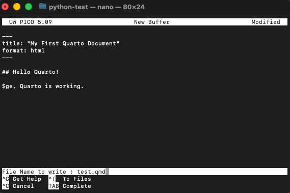test.qmdsomewhere easy to find (like your Desktop or Documents folder) - Go back to your terminal, navigate to where you saved the file, and run: