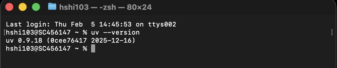 curl -LsSf https://astral.sh/uv/install.sh | shThis downloads and runs the official install script. When it finishes, close your terminal and open a new one so the changes take effect.