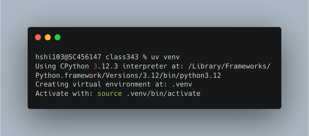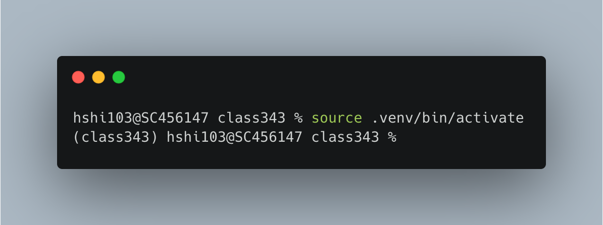 cd class343You’re now inside your empty project folder. Let’s turn it into a proper Python project.