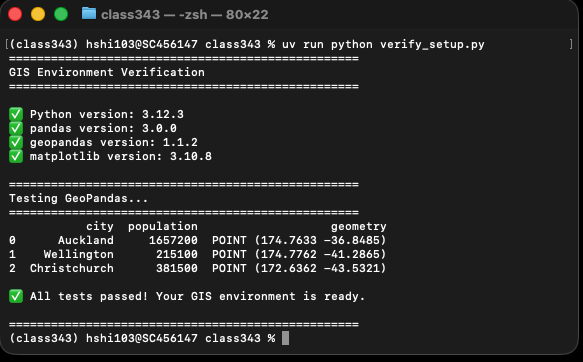 uv run python -c "import geopandas as gpd; print('✅ GeoPandas', gpd.__version__)"If everything is set up properly, you should see: