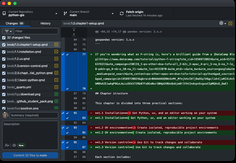 When you’ve finished a chunk of work (or you’re wrapping up for the day), open GitHub Desktop. The left panel will show you every file that changed. Click through them and review the diffs in the centre panel to make sure everything looks right.