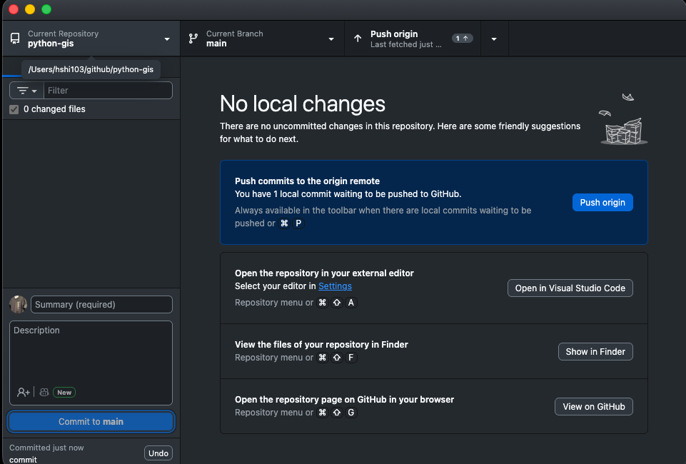 After committing, click Push origin in the top-right area. This uploads your latest commits to GitHub, so your work is backed up online.