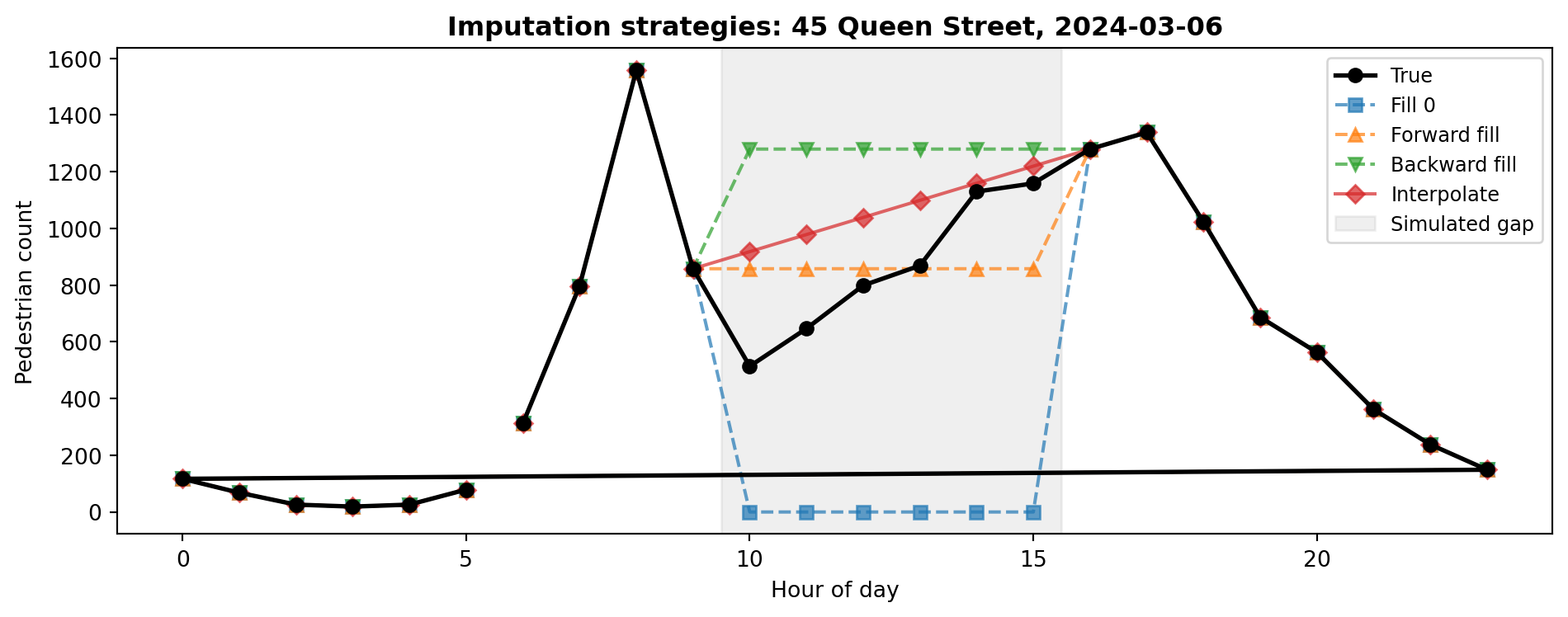 # Simulate a sensor outage: remove hours 10-15 on a busy weekdaysensor ="45 Queen Street"sim = ped[["Date", "Time", "hour", sensor]].copy()# Pick a Wednesday in March (a busy weekday)target_date = pd.Timestamp("2024-03-06")mask = (sim["Date"] == target_date) & (sim["hour"].between(10, 15))print(f"Rows to blank out: {mask.sum()}")print(f"True values we are hiding:")print(sim.loc[mask, ["hour", sensor]].to_string(index=False))# Replace with NaNsim.loc[mask, sensor] = np.nan