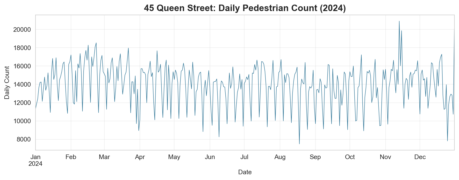 This lab takes you through a complete data analysis workflow using real hourly pedestrian counts from 21 sensor locations across Auckland’s city centre in 2024. The data are sourced from Heart of the City and record how many people passed each sensor during every hour of the year.