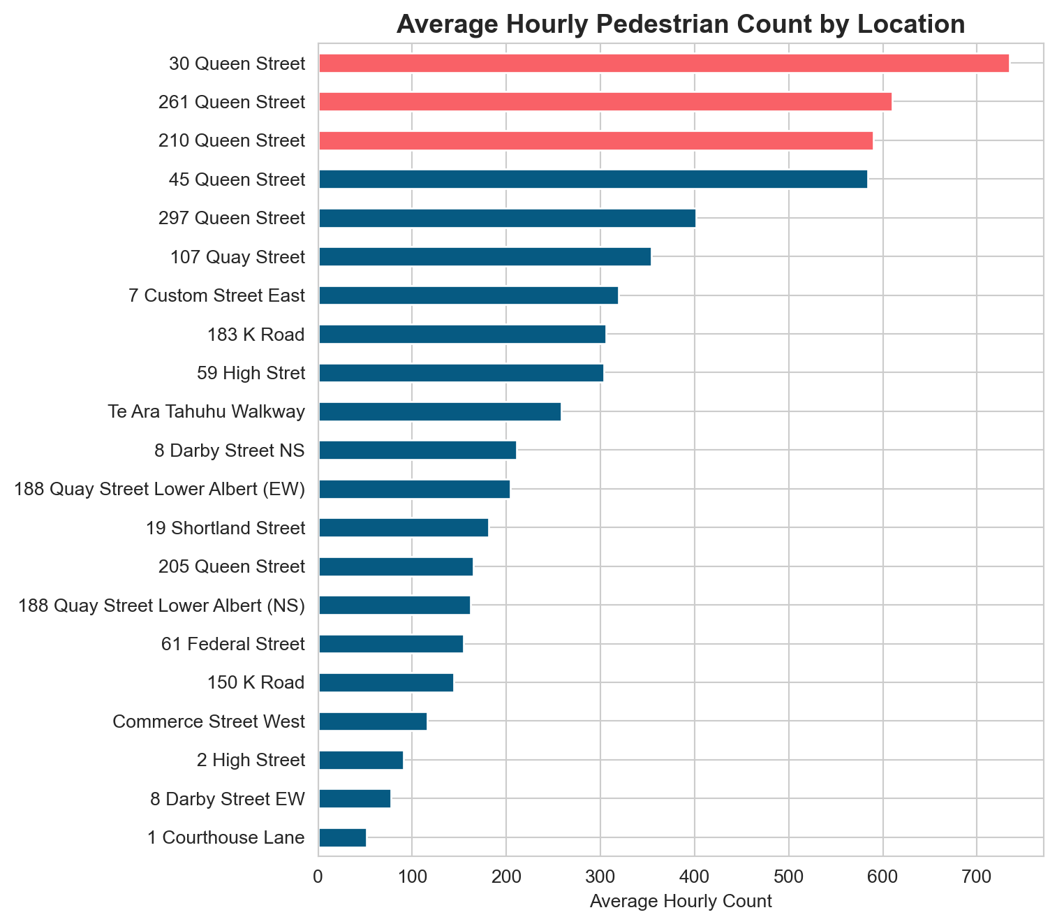 # Average hourly count per locationavg_by_location = ped[sensor_cols].mean().sort_values()fig, ax = plt.subplots(figsize=(8, 7))colours = ["#F96167"if v >= avg_by_location.nlargest(3).min() else"#065A82"for v in avg_by_location]avg_by_location.plot.barh(ax=ax, color=colours)ax.set_title("Average Hourly Pedestrian Count by Location", fontsize=14, fontweight="bold")ax.set_xlabel("Average Hourly Count")plt.tight_layout()plt.show()
