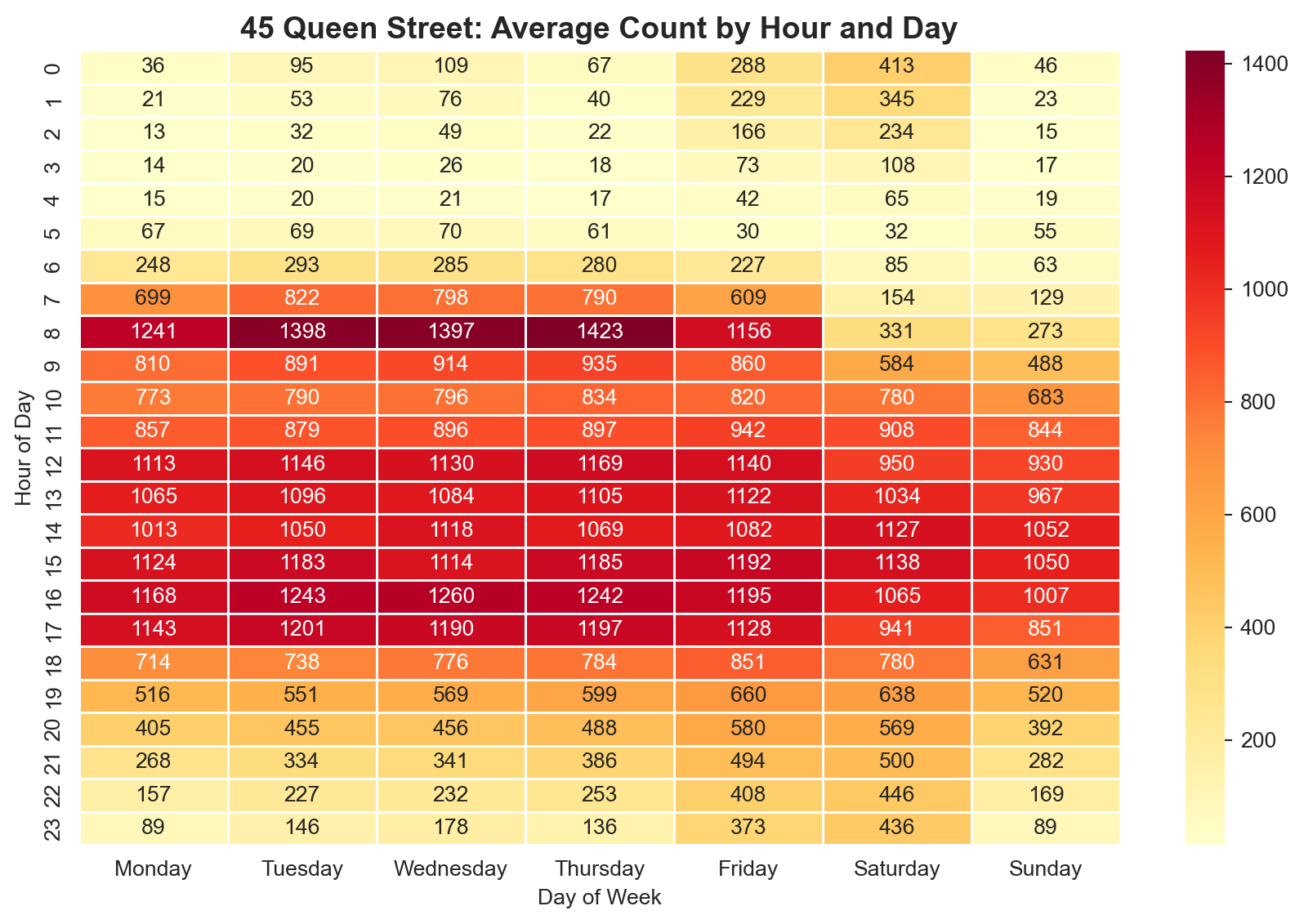 This heatmap reveals the temporal rhythm of the street: strong weekday lunchtime peaks, lower weekend activity, and near-zero counts in the early morning hours.