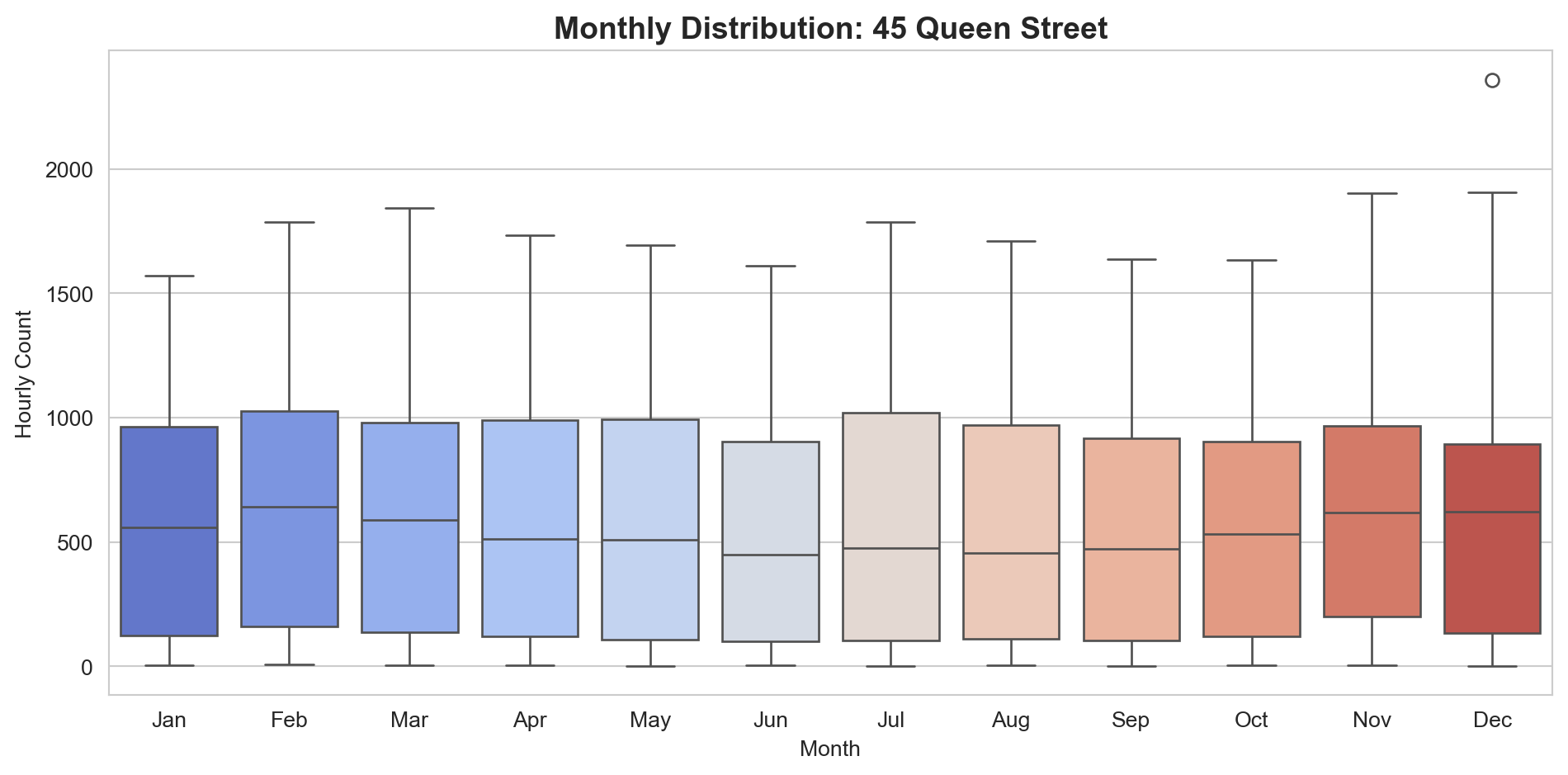 Box plots show the distribution (median, quartiles, and outliers) for each month. This helps you see whether the variability changes seasonally, not just the average.