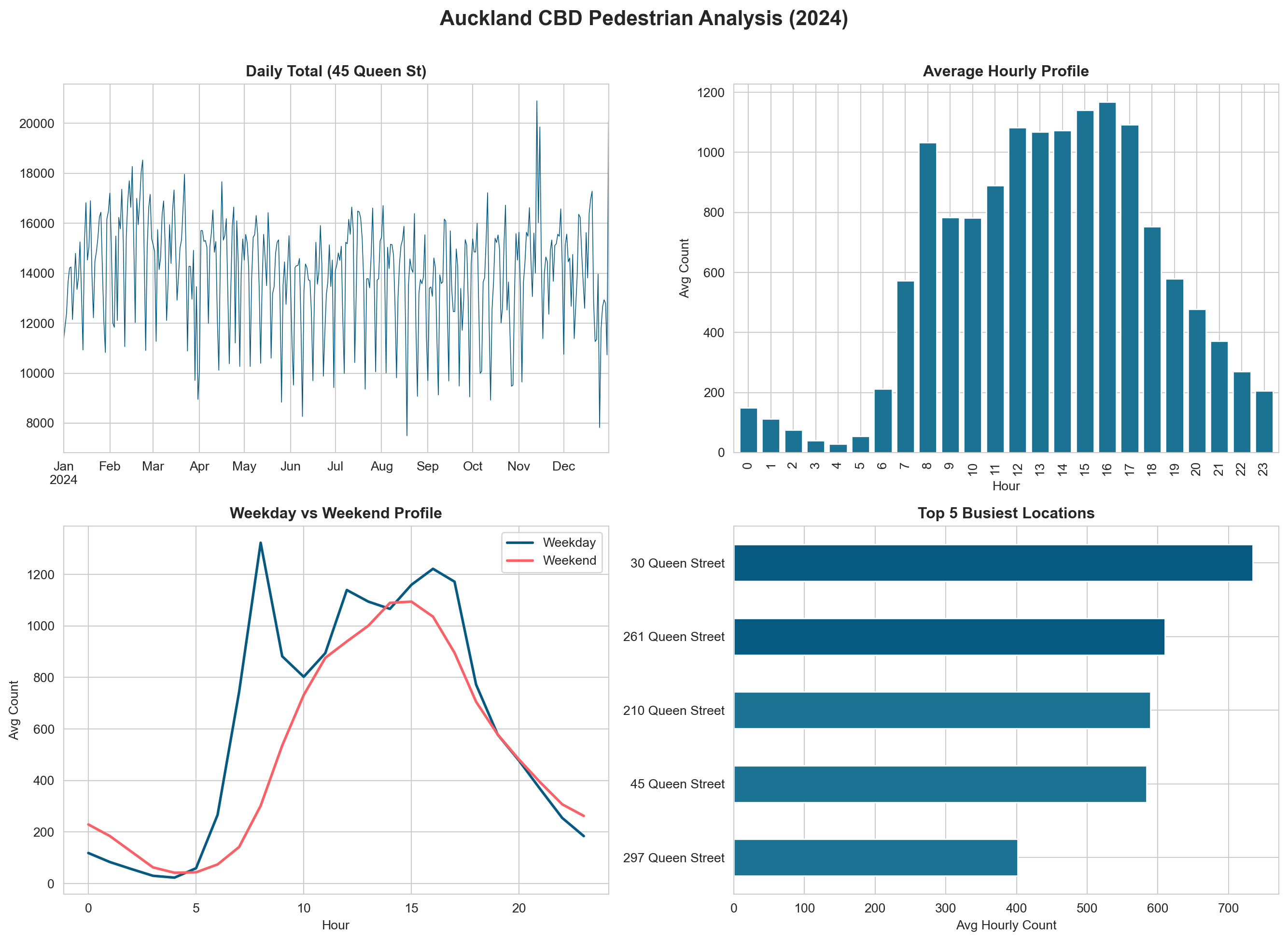 Written interpretation: Below each figure, write 2-3 sentences explaining what the visualisation shows and what it means for understanding pedestrian behaviour in Auckland.