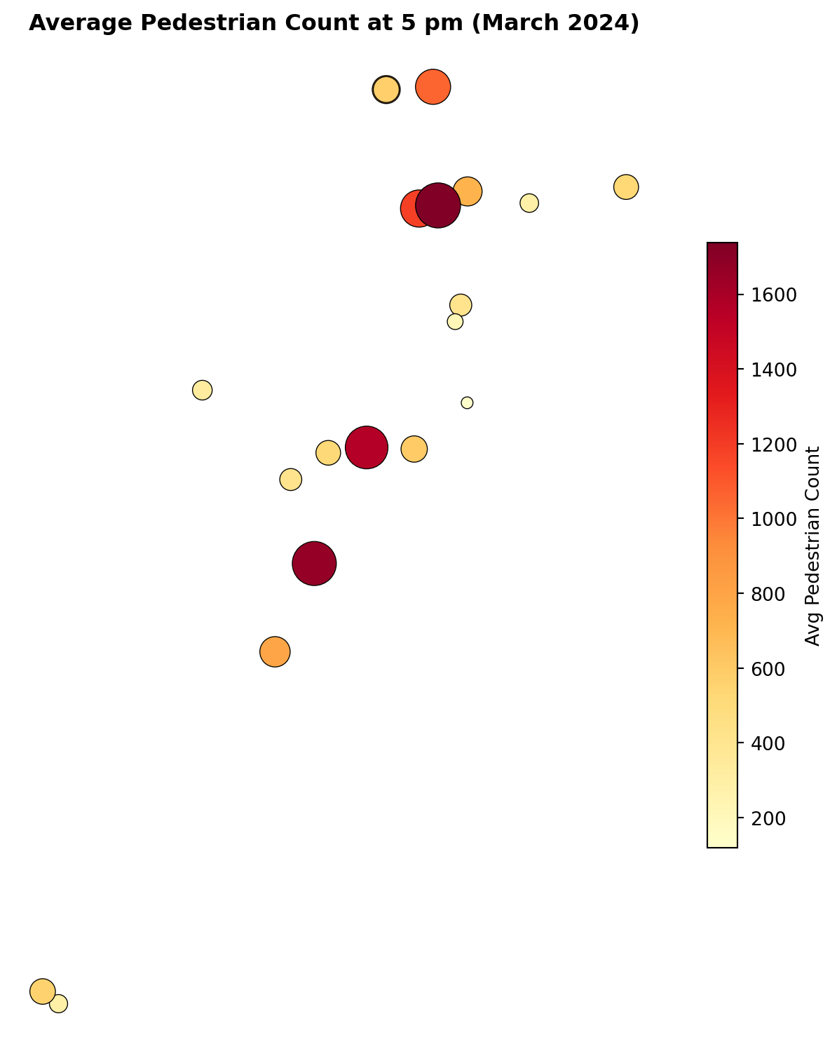 The .explore() map uses the same dot size for every sensor. We can use the folium library to draw circles whose size reflects the pedestrian count, making busy sensors visually larger.