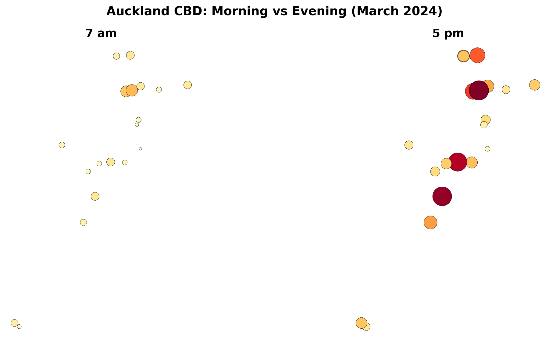 # Pick two hours to comparemorning = gdf[gdf["hour"] ==7]evening = gdf[gdf["hour"] ==17]# Use a consistent colour scale so the maps are comparablevmin = gdf["avg_count"].min()vmax = gdf["avg_count"].max()fig, (ax1, ax2) = plt.subplots(1, 2, figsize=(14, 6))# Morning mapmorning.plot( ax=ax1, column="avg_count", cmap="YlOrRd", markersize=morning["avg_count"] /3, edgecolor="black", linewidth=0.3, vmin=vmin, vmax=vmax, legend=False)ax1.set_title("7 am", fontsize=14, fontweight="bold")ax1.set_axis_off()ax1.set_aspect("equal")# Evening mapevening.plot( ax=ax2, column="avg_count", cmap="YlOrRd", markersize=evening["avg_count"] /3, edgecolor="black", linewidth=0.3, vmin=vmin, vmax=vmax, legend=False)ax2.set_title("5 pm", fontsize=14, fontweight="bold")ax2.set_axis_off()ax2.set_aspect("equal")plt.suptitle("Auckland CBD: Morning vs Evening (March 2024)", fontsize=15, fontweight="bold")plt.tight_layout()plt.show()