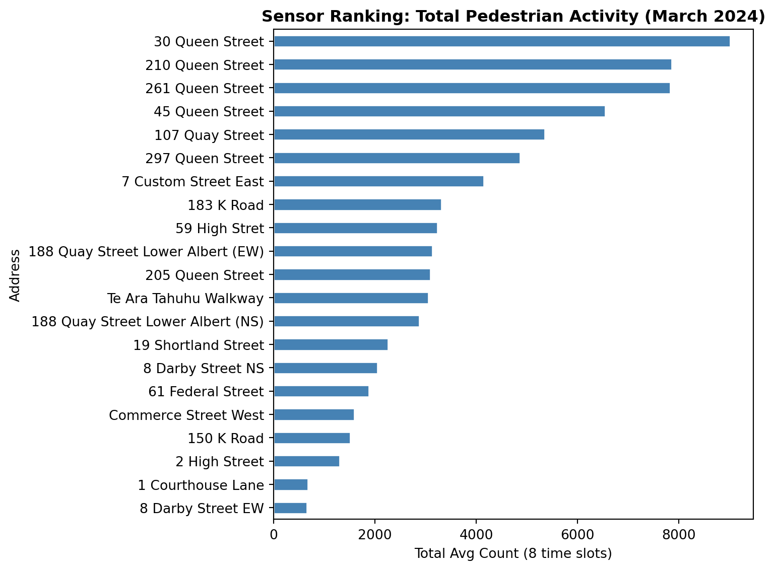 # A simple bar chart of total countsfig, ax = plt.subplots(figsize=(8, 6))total_by_sensor.sort_values().plot.barh(ax=ax, color="steelblue", edgecolor="white")ax.set_xlabel("Total Avg Count (8 time slots)")ax.set_title("Sensor Ranking: Total Pedestrian Activity (March 2024)", fontweight="bold")plt.tight_layout()plt.show()